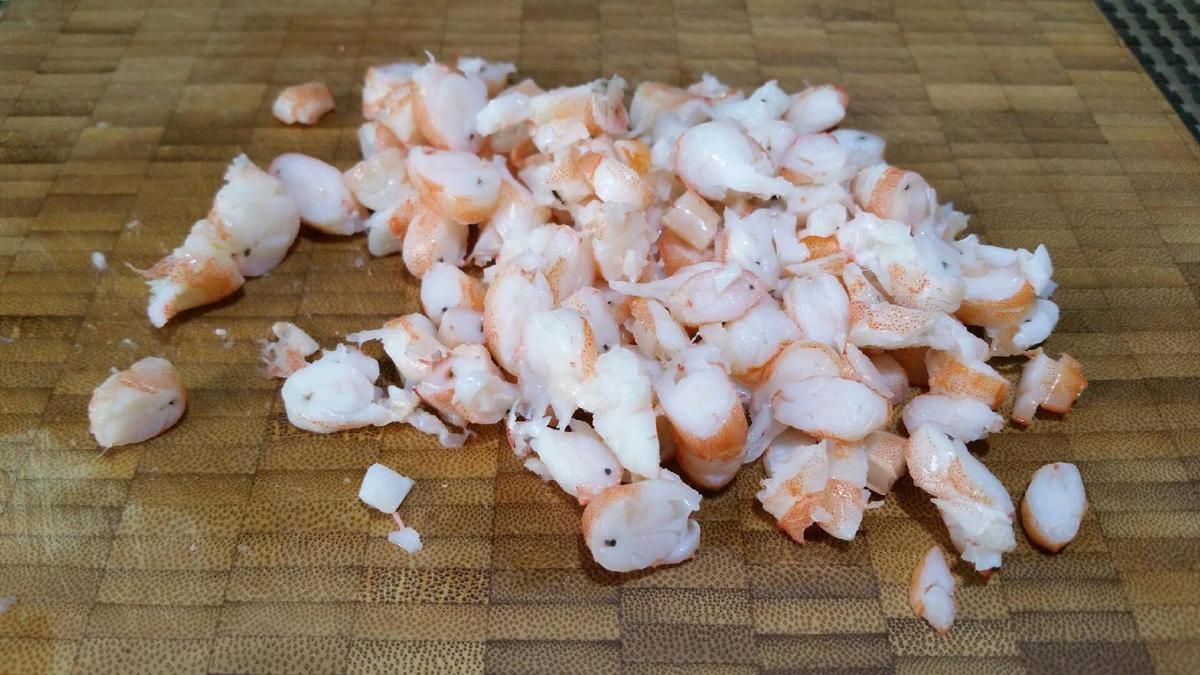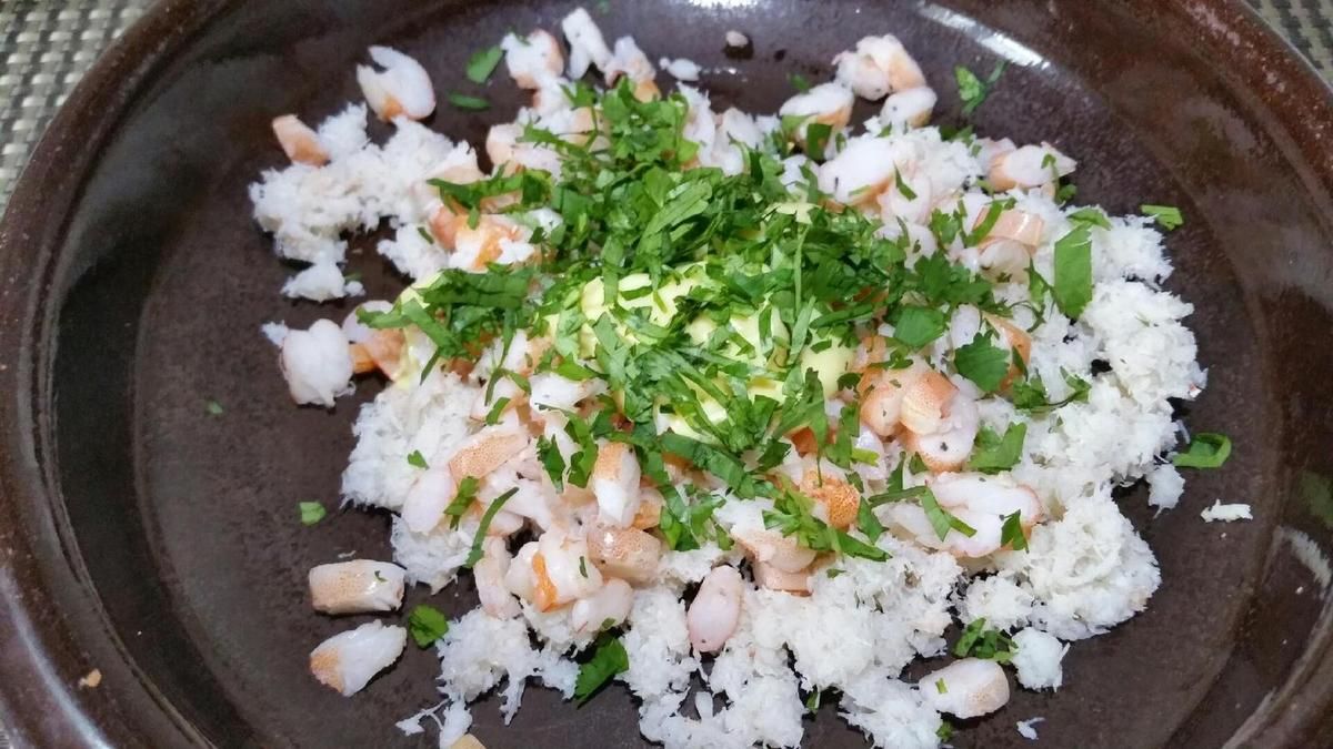 2 - Monter une mayonnaise maison (jaune d'oeuf, huile d'arachide, une fois la consistance souhaitée atteinte, incorporer 1 cuil. à soupe de moutarde et assaisonner avec sel et poivre), ou utiliser une mayonnaise toute prête. Emietter le crabe dans un récipient, ajouter les gambas, 1 bonne cuil. à soupe de mayonnaise, la coriandre ciselée, mélanger le tout, incorporer un filet de jus de citron, saler et poivrer. Mettre au réfrigérateur.
