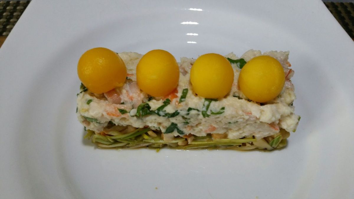 fondant exotique de crabe et gambas citronnés, noix de cajou et ses billes de mangue