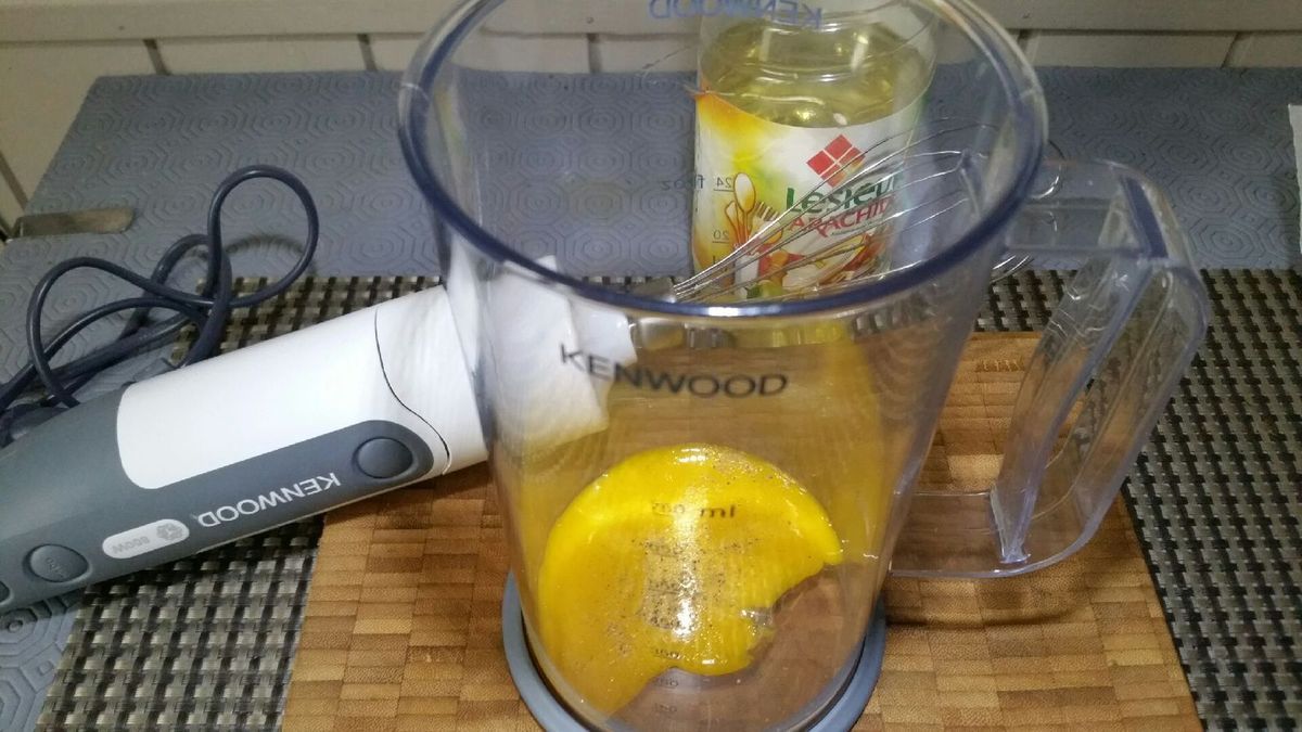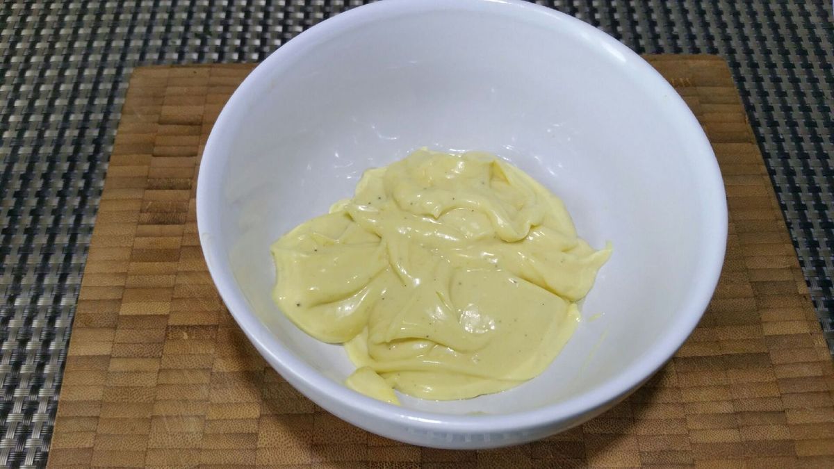 10 - mayonnaise maison (1 j'aune d'oeuf, 1 cuil.à soupe de moutarde, huile d'arachide, poivre et sel)