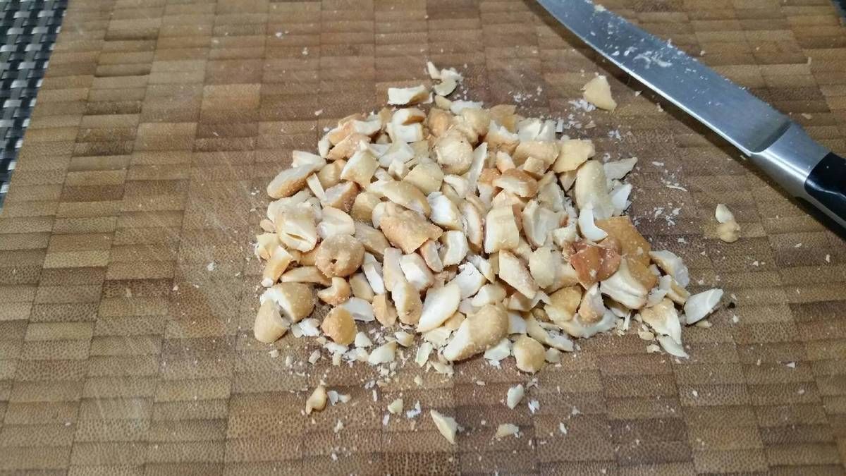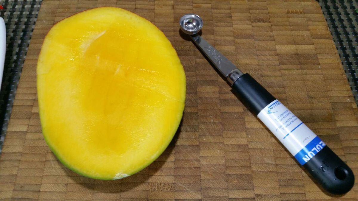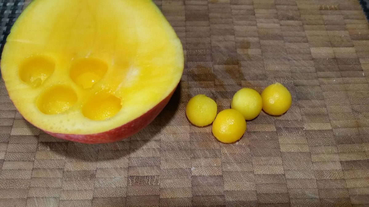 3 - Tailler grossièrement les noix de cajou (pour garder le croquant). Vérifier que le poireau émincé est bien confit. Laver et couper une moitié de mangue et prélever de petite billes dans la chair à l'aide d'une cuillère parisienne.