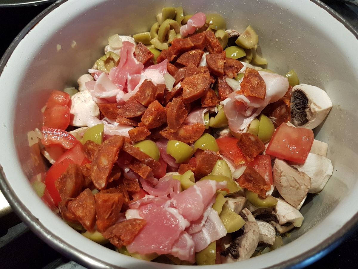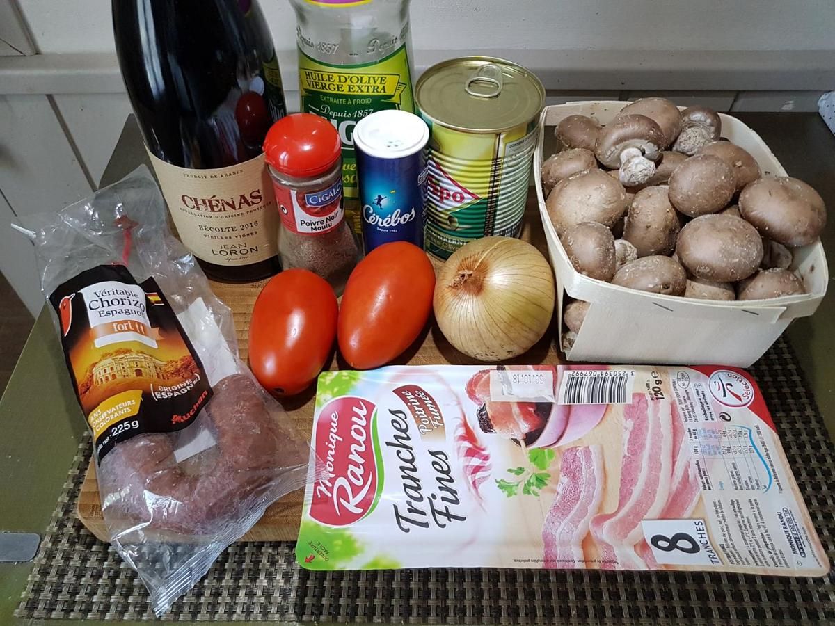 1 - Nettoyer ou peler les champignons, ôter les pieds (les conserver pour réaliser une autre recette, un velouté par exemple) et tailler les têtes en quatre. Eplucher l'oignon et le ciseler. Tailler en dés les tomates épépinées, les olives dénoyautées, et le lard en morceaux plus gros. Couper le chorizo en rondelles puis en quartiers. Faire revenir l'oignon dans une casserole avec l'huile d'olive. Rajouter les champignons, mélanger, puis incorporer le reste des ingrédients. Verser les 20 cl de vin rouge, assaisonner avec sel et poivre, et laisser mijoter sur feu doux 20 mn.